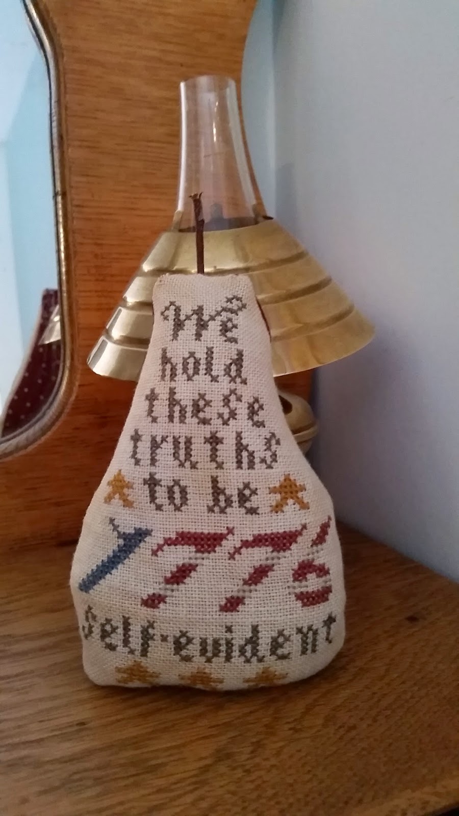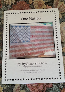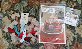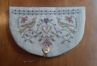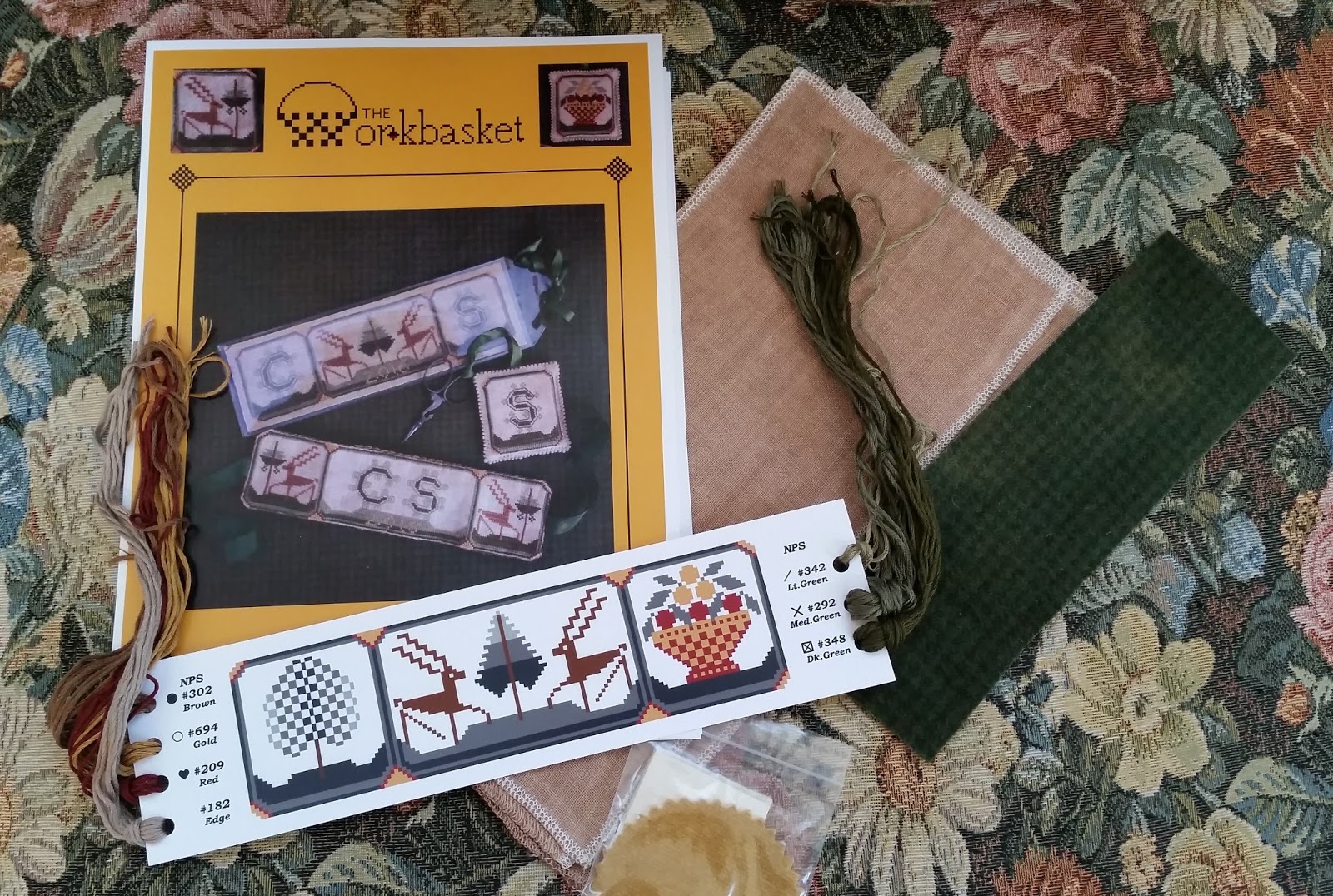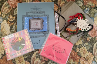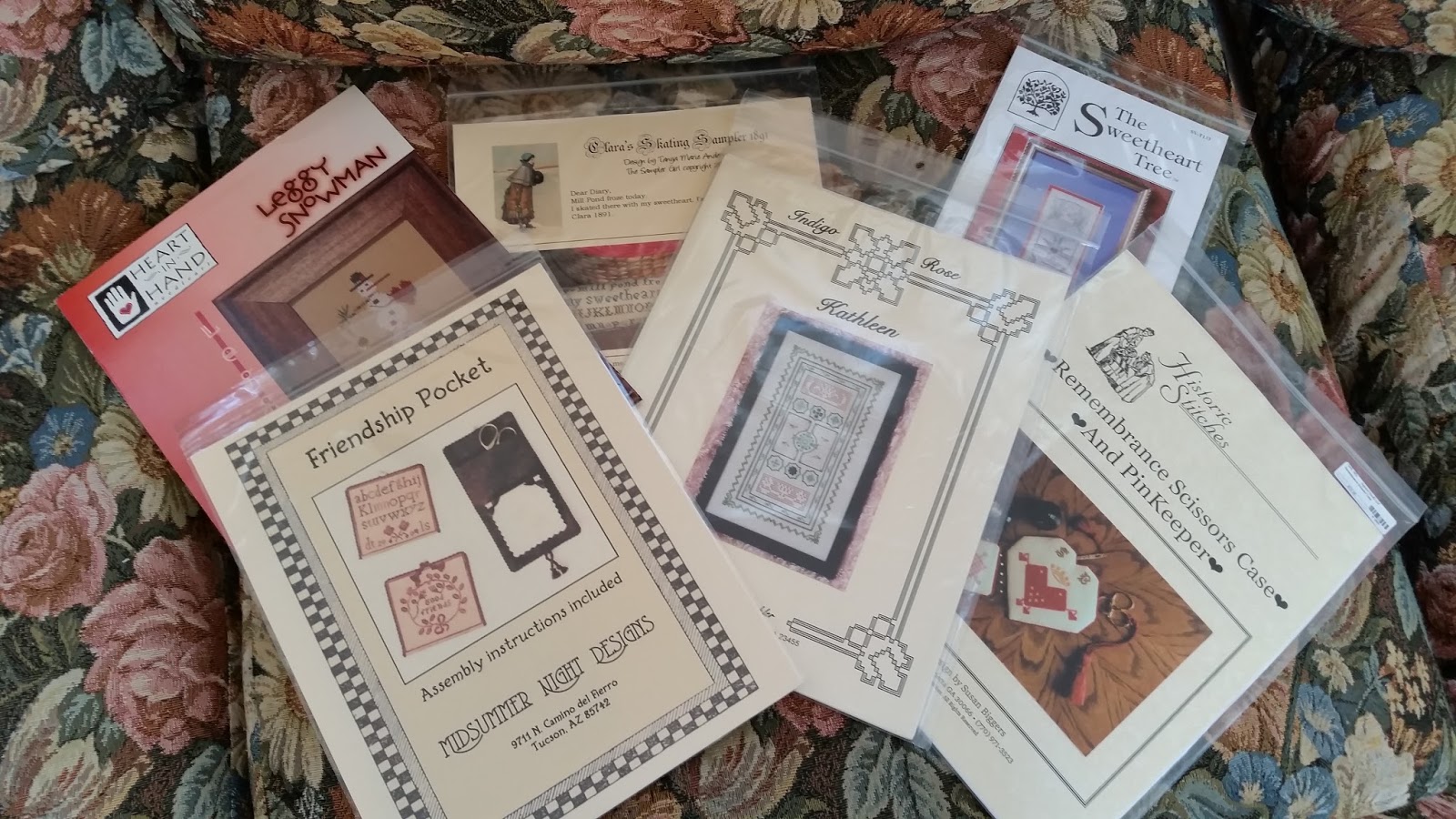 The hardest thing about not having an LNS is getting linen of the right color and texture for various projects. Ordering online doesn't always get you what you thought it would. I brought a list of linen to look for at Celebration, but even when I found the right fabric, the color didn't always look as I'd expected. For example, I wanted a piece of PTP Dill to stitch something from a Punch Needle & Primitive Stitcher magazine chart. I found one, but the color was nothing like the one in the magazine, and I didn't like it at all. But I certainly did find plenty of linen to have on hand for future projects (on the far left is a large cloth bag that came free with my purchase from Gypsy Stitching):